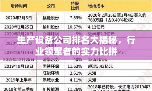 随着工业化的快速发展,生产设备行业日新月异,竞争也日益激烈,在这个背景下,生产设备公司的排名成为了衡量企业综合实力、技术创新能力及市场占有率的重要标准之一,本文将探讨生产设备公司的排名及其背后的因素。
