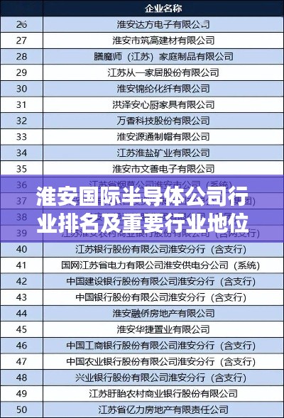 随着全球半导体市场的蓬勃发展,中国的半导体产业也在逐步壮大,在众多半导体公司中,淮安国际半导体公司凭借其卓越的技术实力和市场表现,脱颖而出,成为行业内的一颗璀璨之星,本文将深入探讨淮安国际半导体公司在行业内的排名及其所取得的成就。